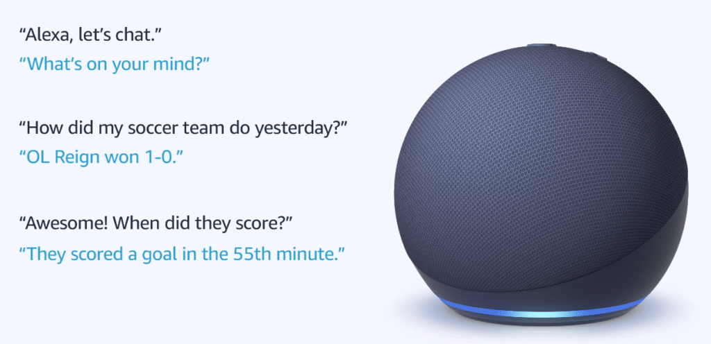 These updates allow people to have an actual continuous conversation with Alexa. Alexa will also remember information about you, and use that for future conversations. An example that Amazon gave was someone asking Alexa to chat, then asking about their soccer team. Alexa knew to continue the conversation past the first prompt, then knew what soccer team was being referred to.