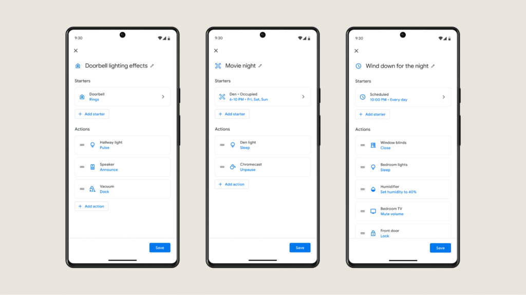 Google is expanding their offering of Starters and Actions under Automations. Automations are a routine of tasks that run, where Starters are the things that trigger the automation to start, and Actions are the things an automation does. This is a very fun, and powerful change for users as it lets them automate more of their home.