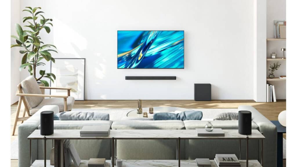 The new BRAVIA Theater products are also meant to work closely with Sony BRAVIA TVs on the control side. When paired with certain BRAVIA models, the TV and audio system can share sound processing and acoustic tuning features. For example, the TV speakers can be used together with the soundbar or theater speakers, so the screen itself can act as a center channel for dialog. This is handled through Sony’s acoustic control features that time and balance the output between the TV and the external speakers. The idea is to keep voices locked to the screen while the surround speakers handle effects and ambient sound around the viewer.